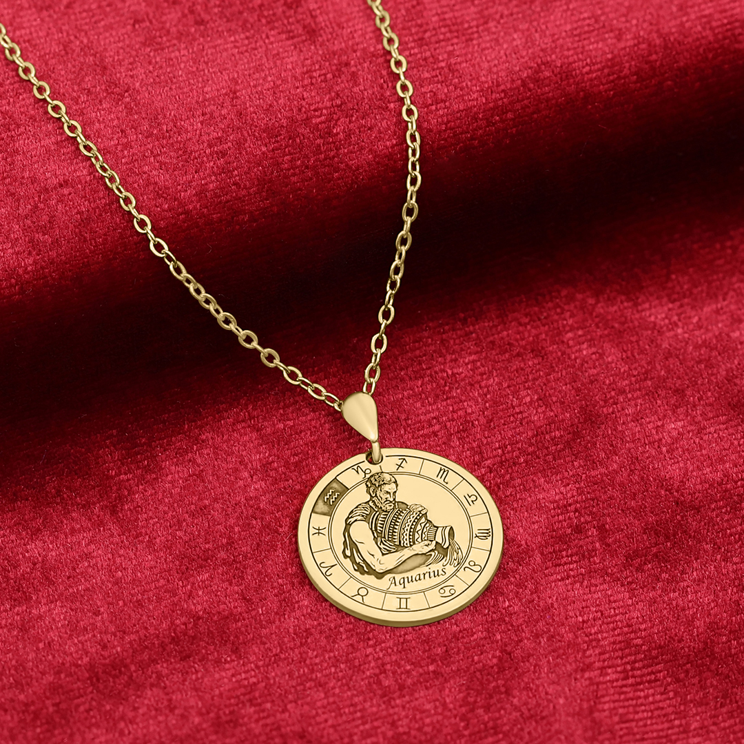 יצירתיות, חופש וחשיבה מחוץ לקופסה – תליון מטבע מוזהב עם חריטה מרשימה של מזל דלי (Aquarius) וסמלי גלגל המזלות המקיפים אותו.