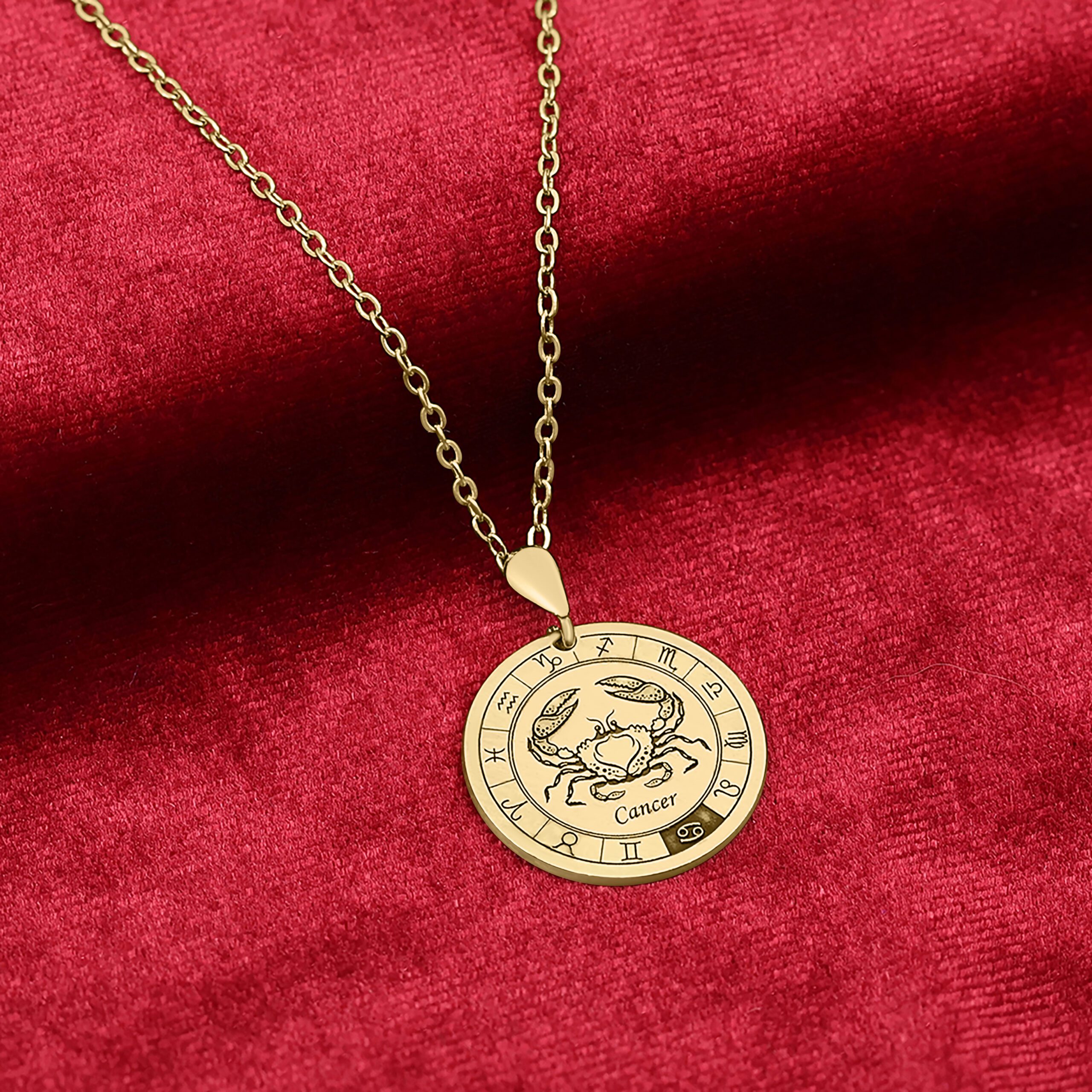 לב ענק, רגישות וחיבור עמוק למשפחה – תליון מטבע מוזהב עם חריטה מדויקת של סמל הסרטן (Cancer) וסמלי גלגל המזלות.