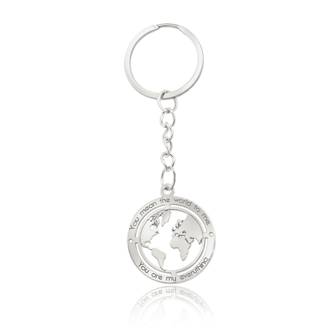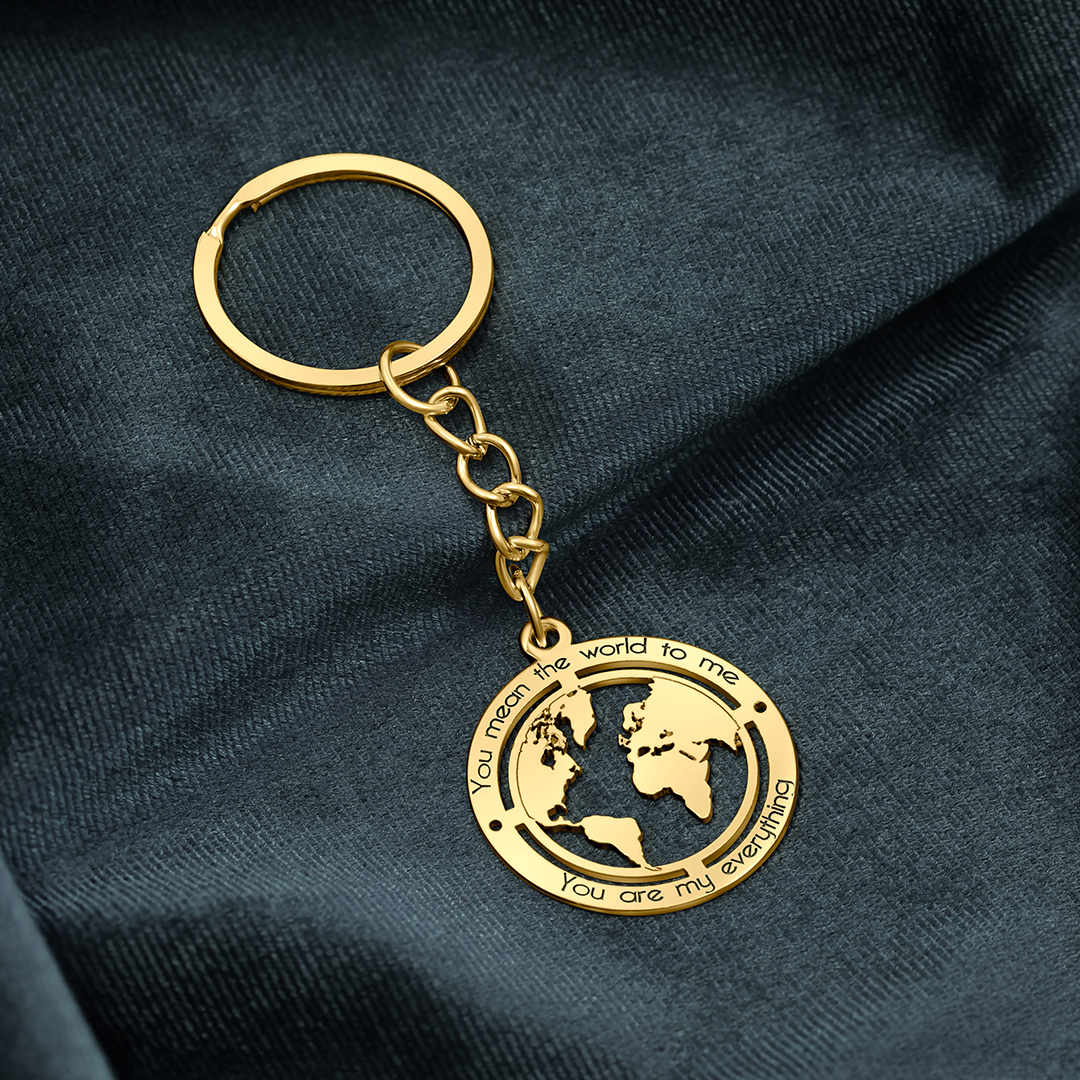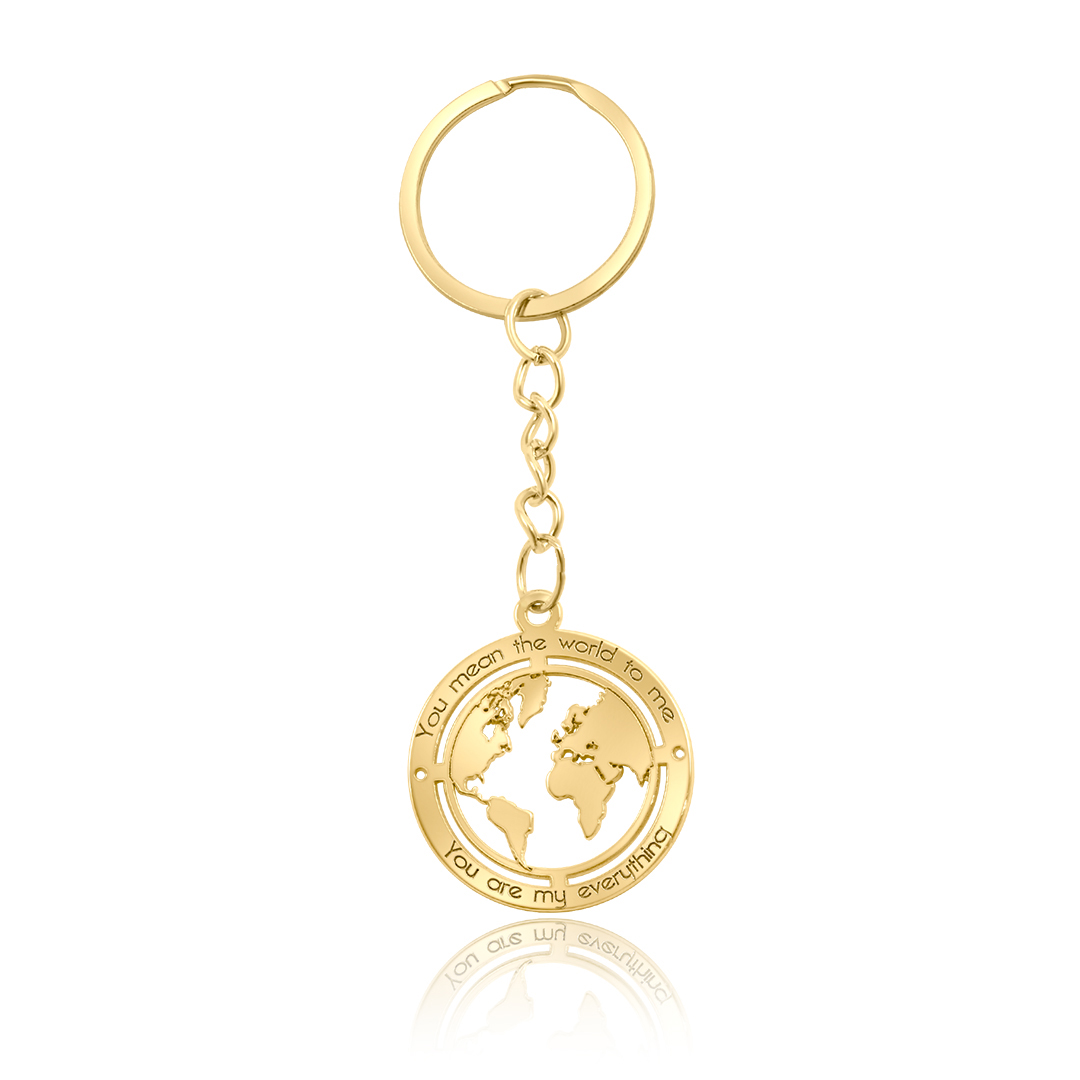 מחזיק מפתחות ייחודי בציפוי זהב, בעיצוב של מפת העולם עם חריטה כפולה: