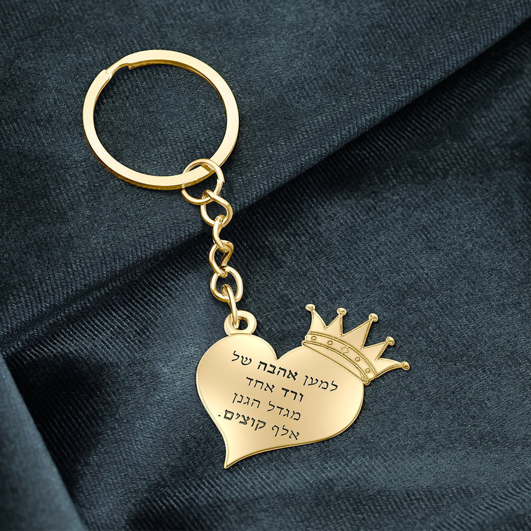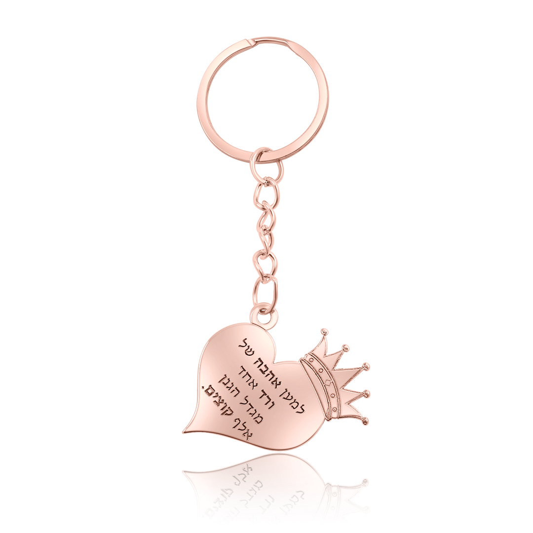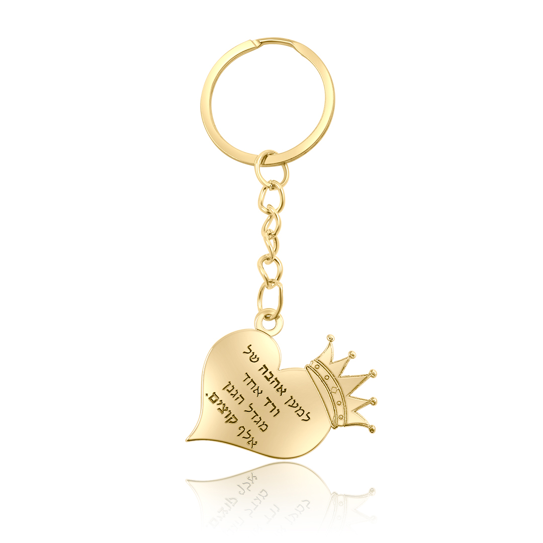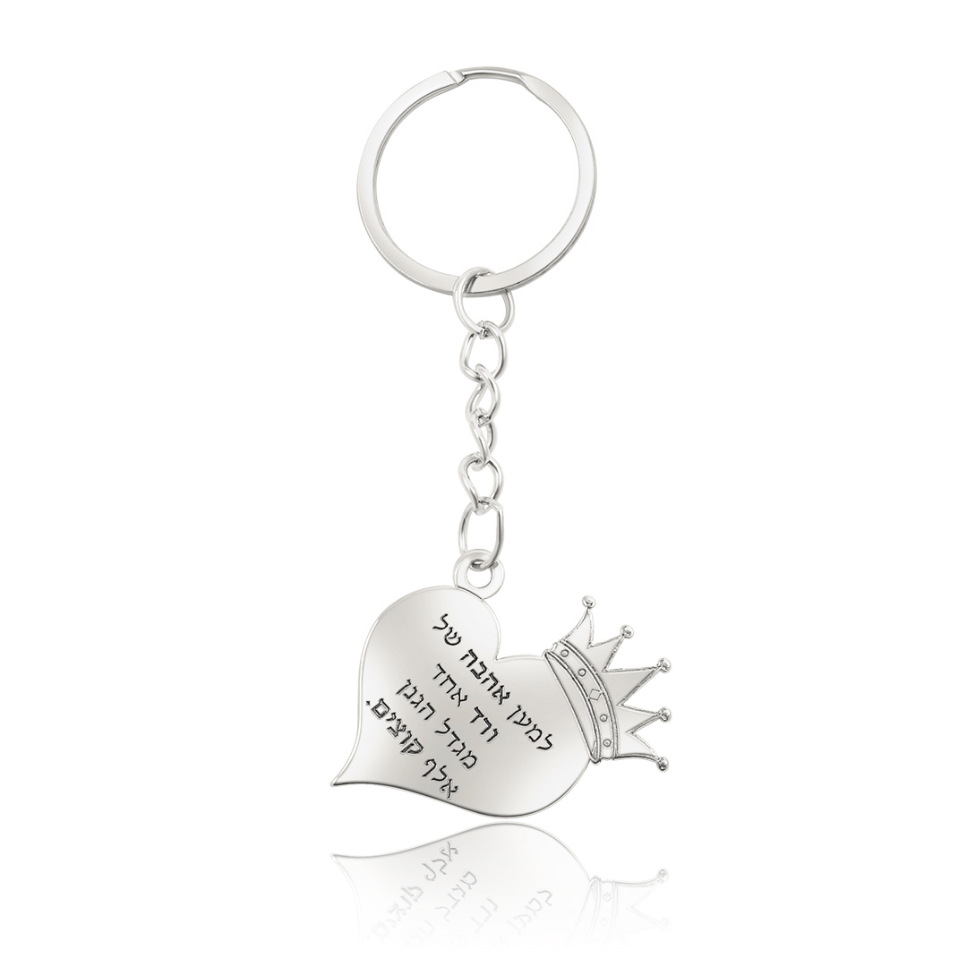 מחזיק מפתחות מעוצב בצורת לב מלכותי עם כתר עדין, חריטה אישית מלאה במשמעות ועיצוב שמשדר אהבה, הערכה ומלכותיות – בכל פעם מחדש.