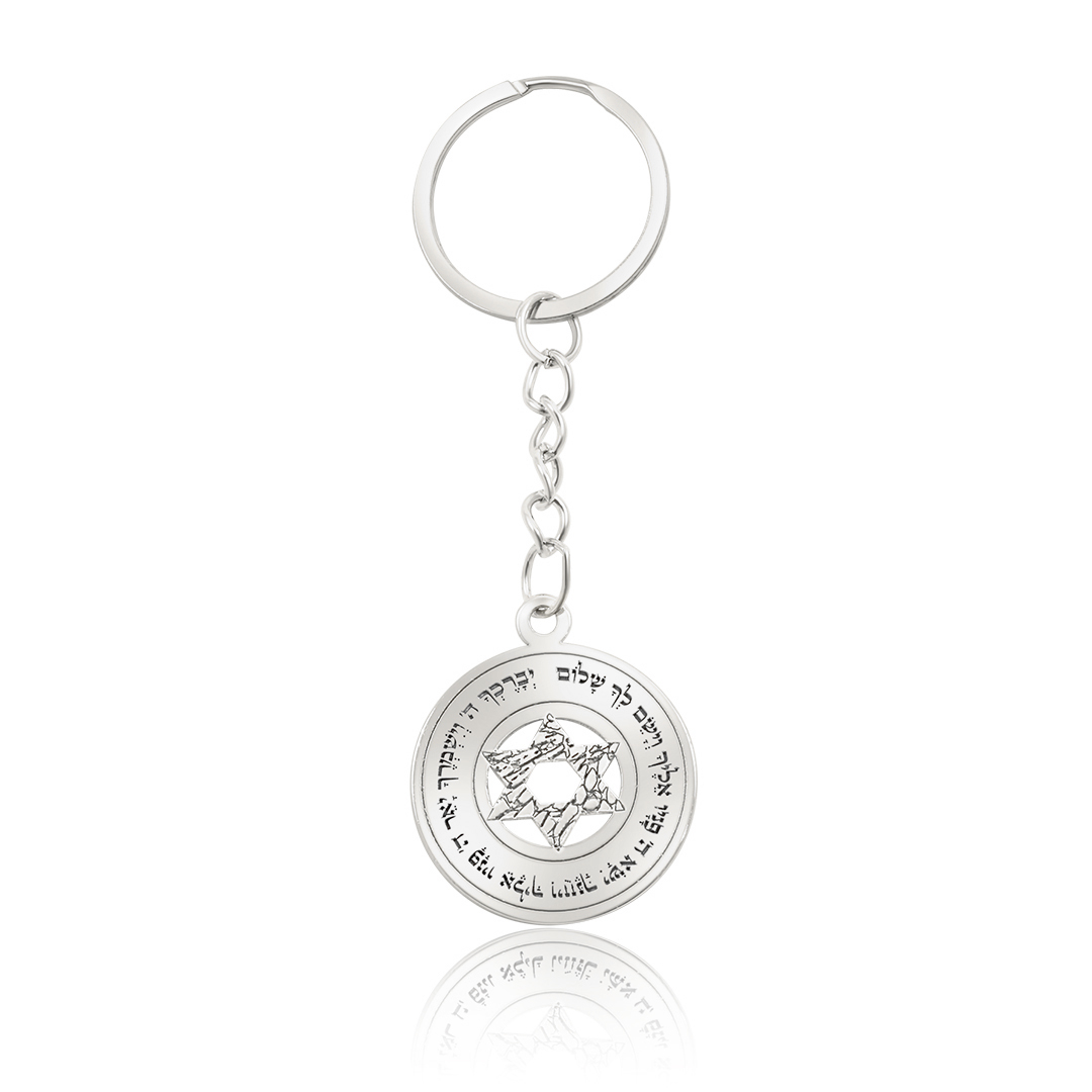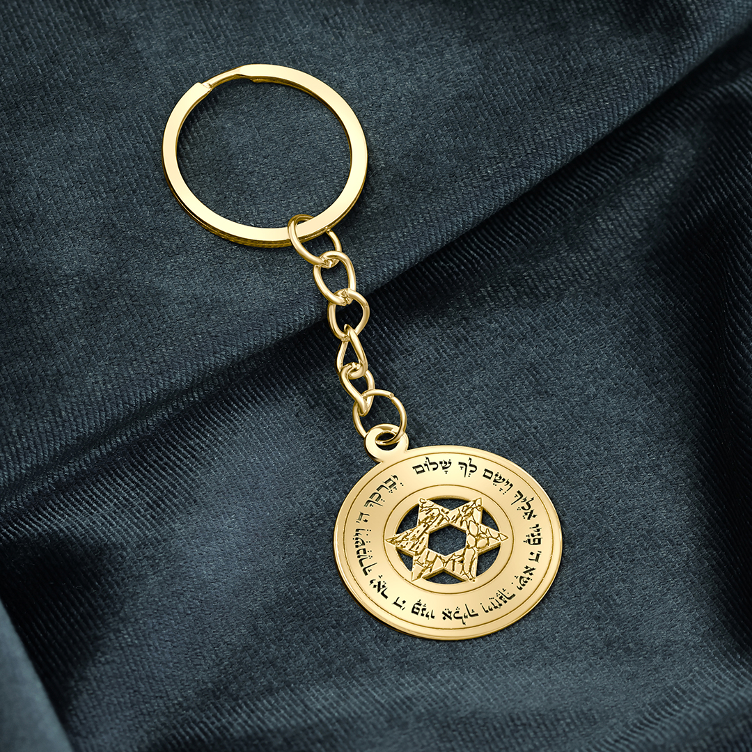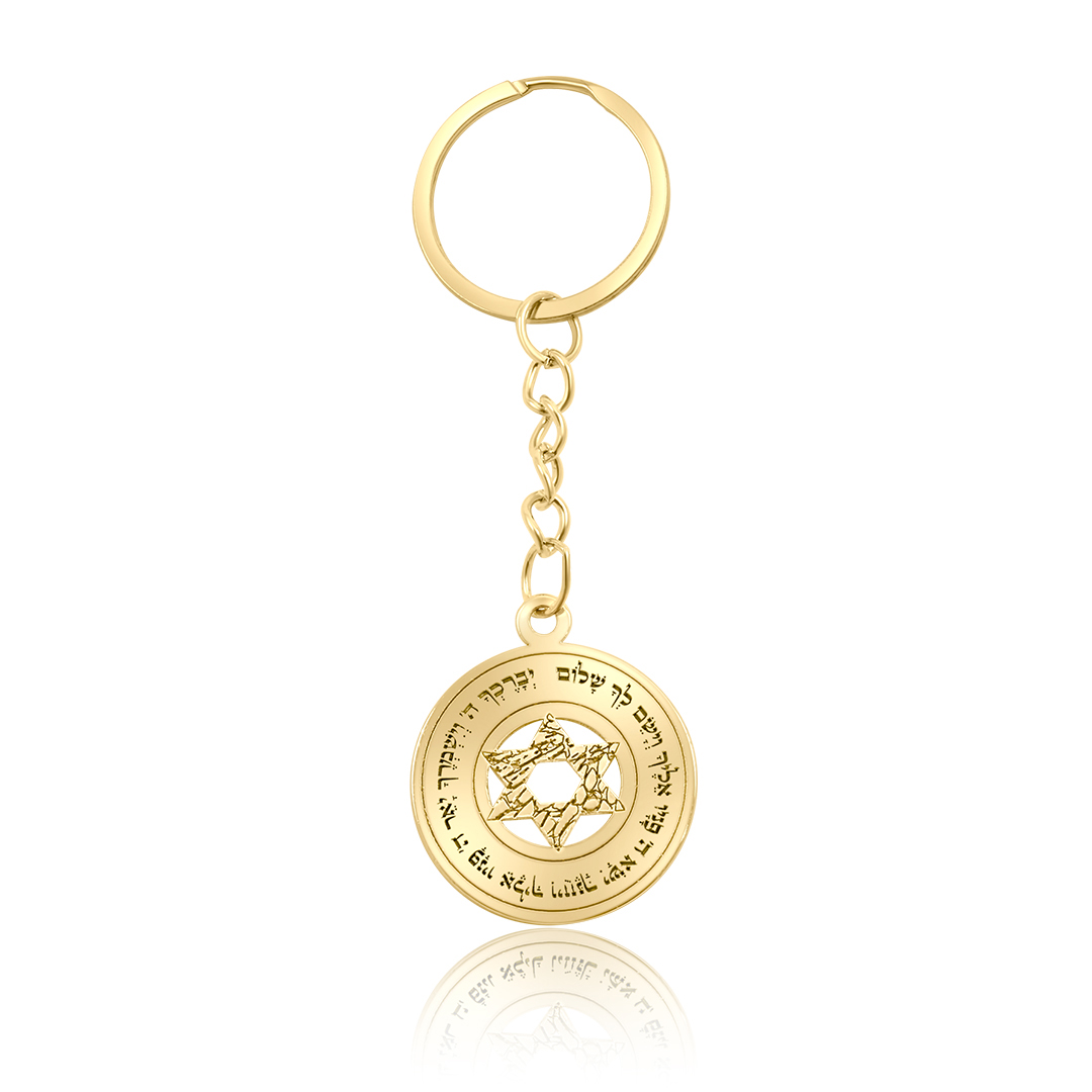 מחזיק מפתחות ייחודי ועוצמתי מזהב עם חריטת מגן דוד בעיצוב גיאומטרי ופסוק ברכה מסביבו – מתנה מושלמת למי שקרוב לליבכם ולבעלת ערך רוחני.