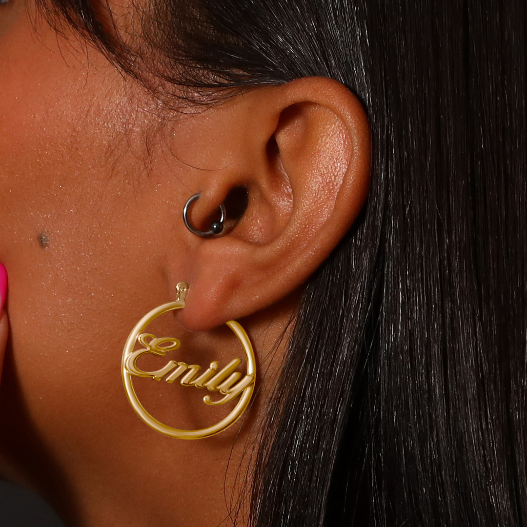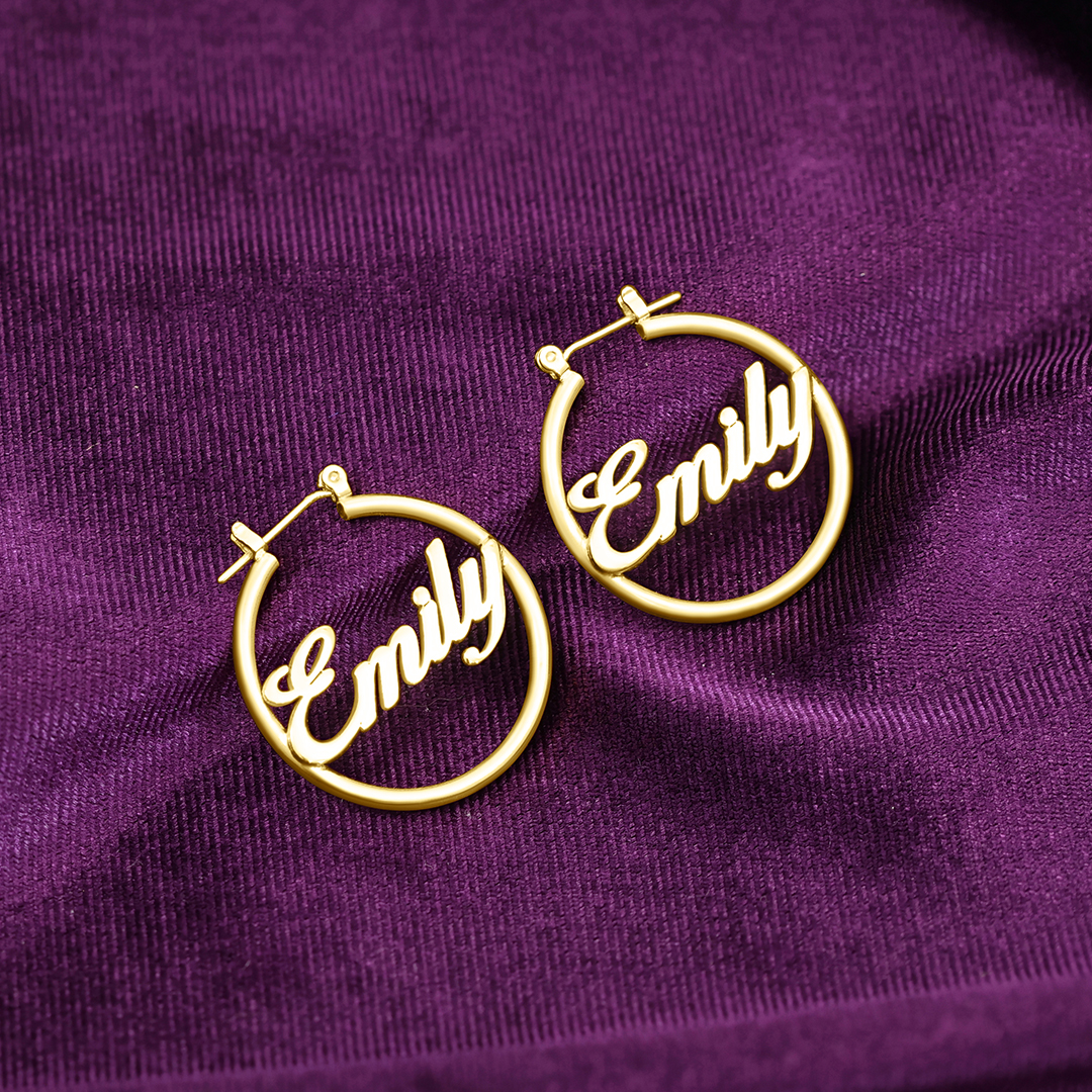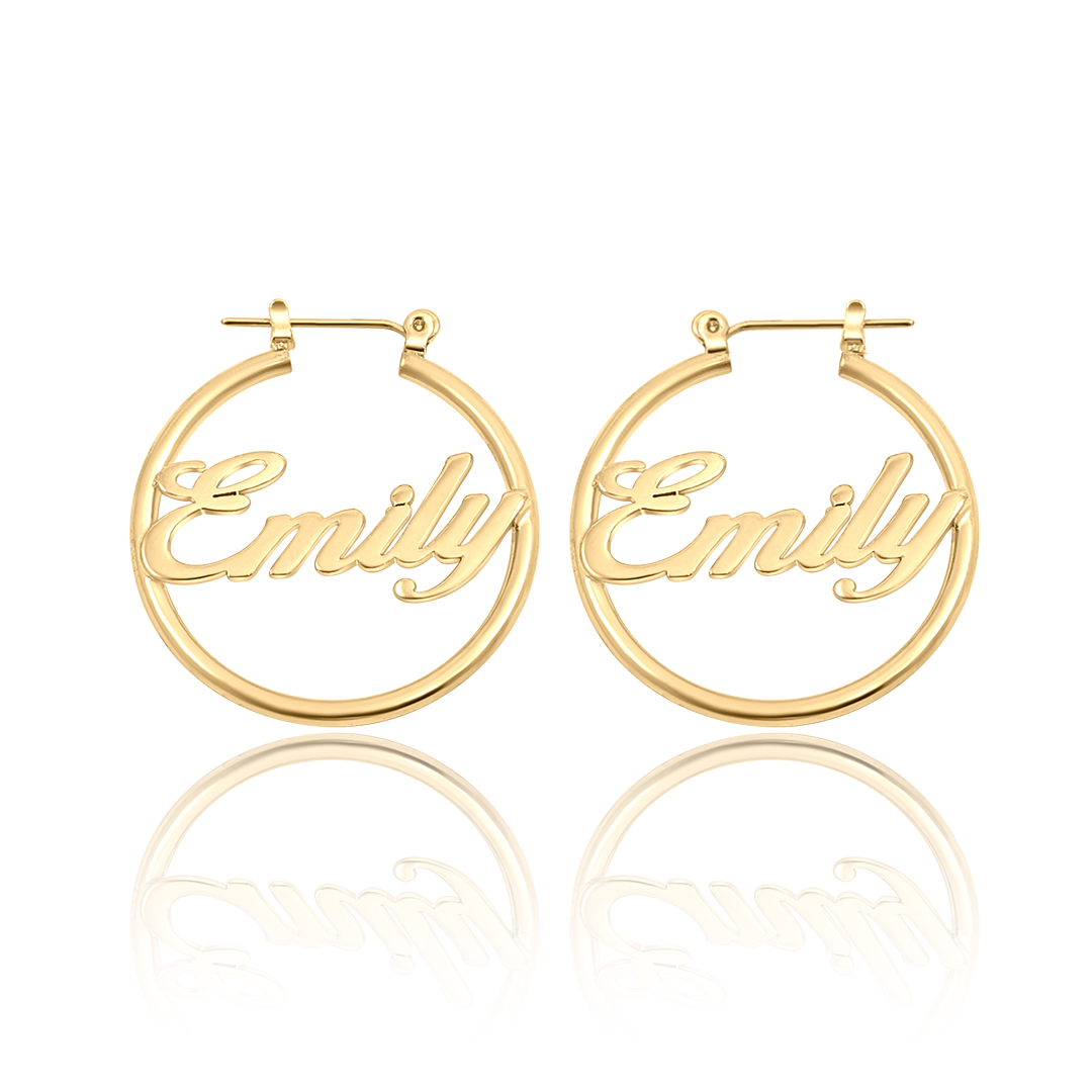 עגילים עגולים בעיצוב חישוק קלאסי, המשולבים עם שם לבחירתך במרכזם.