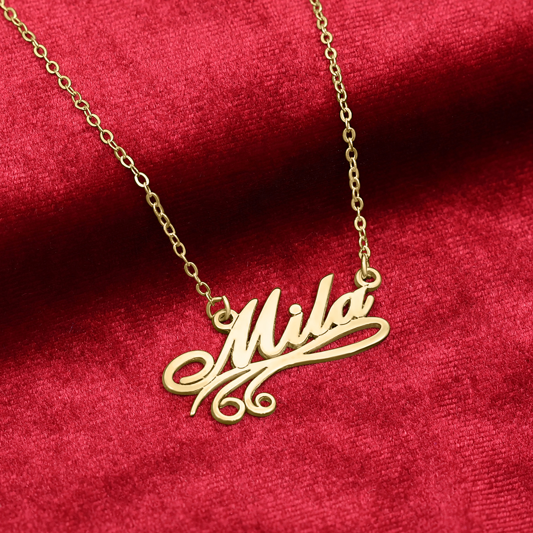 תכשיט עם סטייל ונשמה – שרשרת מוזהבת בעיצוב קליגרפי אלגנטי עם השם Mila, בגופן מתפתל ויוקרתי שמשדר אישיות, עדינות ונוכחות.