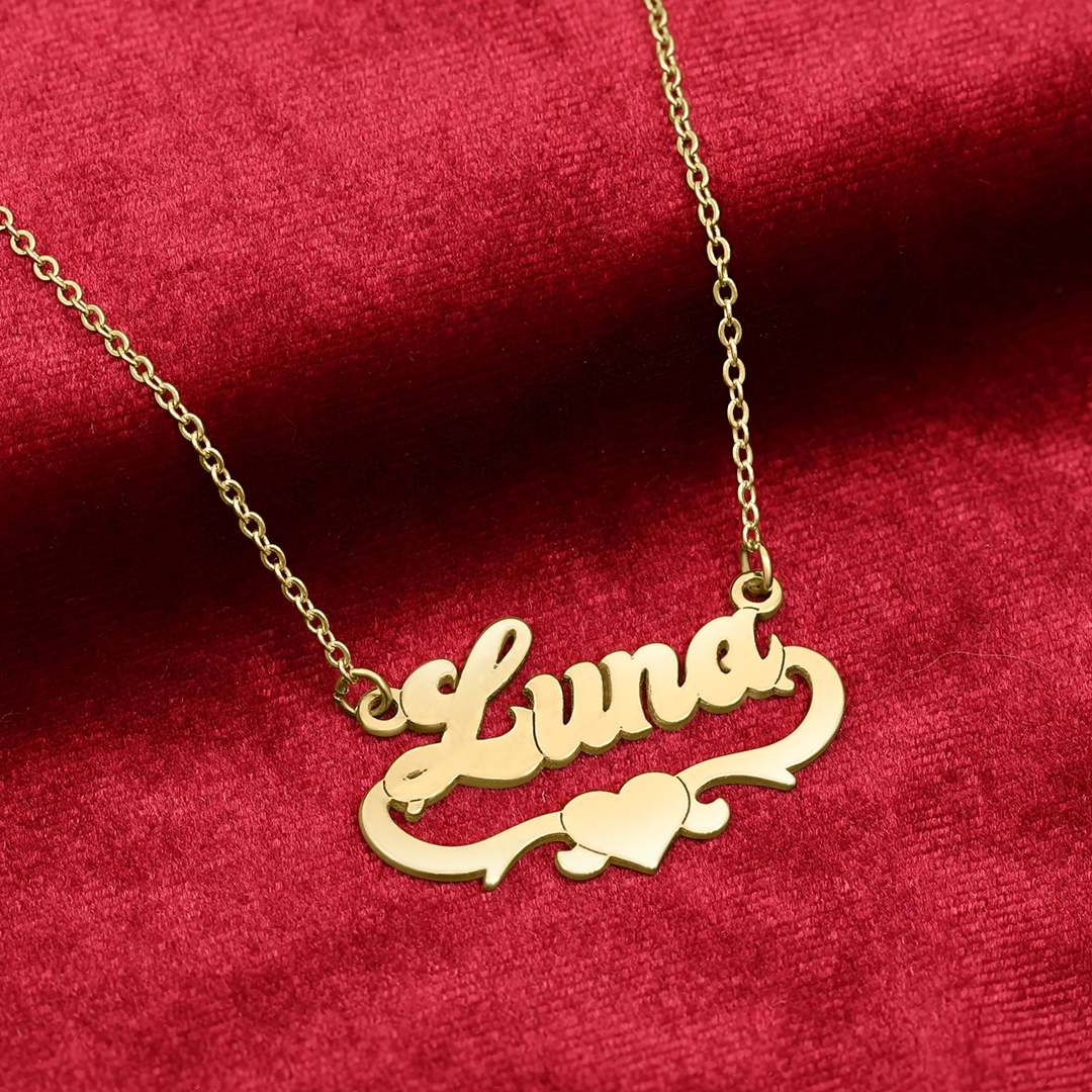 סטייל אישי במגע רומנטי – שרשרת מוזהבת עם כיתוב Luna בגופן אלגנטי וזורם, משולבת עם לב עדין מתחת לשם.